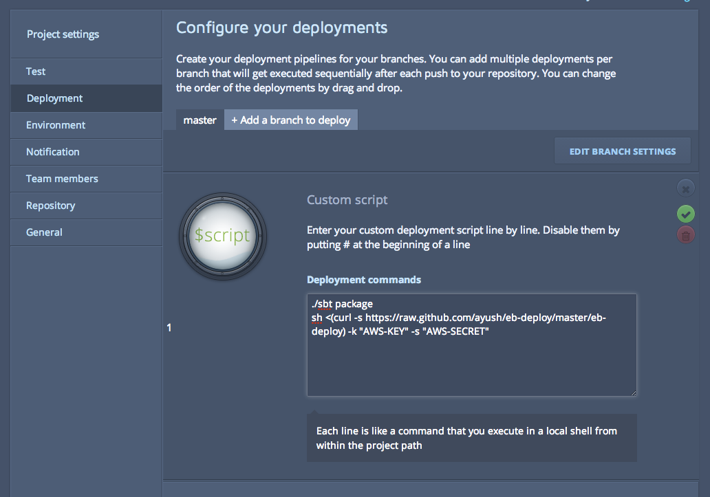 Lastly, we just need to invoke eb-deploy from codeship. Thats done from the Depoyment tab in Codeship as below: