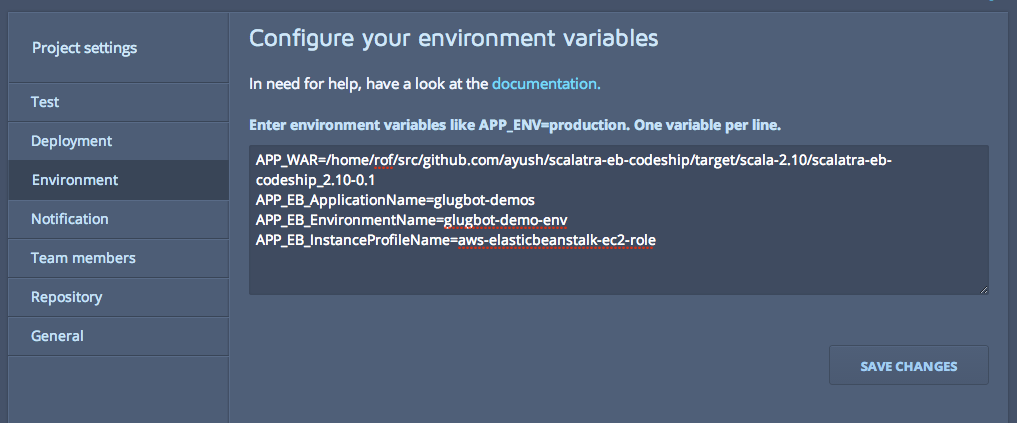The way we'll set this up in Codeship is pass the IAM profile, application, environment and WAR file location as custom environment variables: