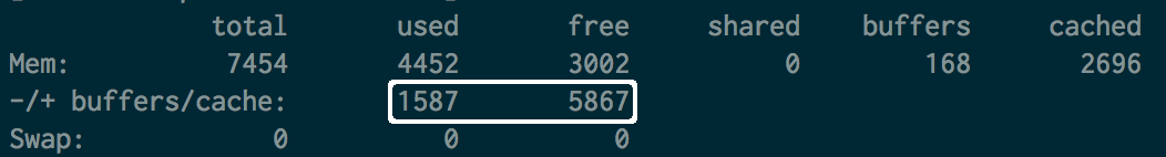 shows high level overview of memory usage. You may be tempted to consider values in first row (Mem) as representing the free/used memory. However, the effective used/free memory is in the second row, as outlined in white below: